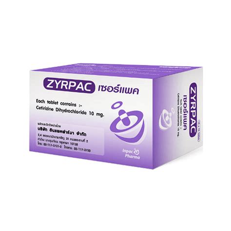 ZYRPAC (อินแพคฟาร์มา) (cetirizine hydrochloride 10 mg) film-coated tablet, 1 tablet (TPU). ความแรง. 10 mg. ชื่อการค้า. ZYRPAC. ชื่อผู้ผลิต. อินแพคฟาร์มา. ชื่อการค้า (อังกฤษ) :.